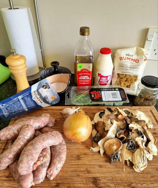 Orecchiette in a creamy Toulouse sausage and wild mushrooms sauce