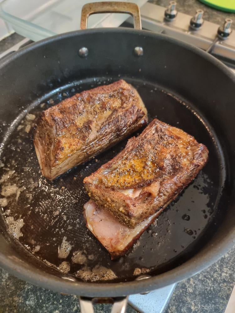 • Heat about 3 Tblsp oil in a heavy bottomed pan. When hot, brown the beef short ribs well on all sides and remove from the pan