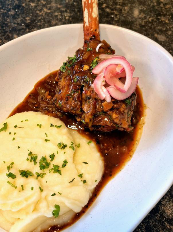 • Cook in the oven for approximately 2 - 2 ¼ hours, turning the shanks over halfway through. The meat will be tender and nearly falling off the bone, but still have some bite to it.