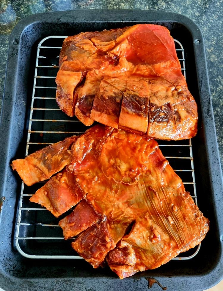 • Remove from the oven and remove foil, put ribs on a board and pour out the remaining water and remove the rack from the baking tray