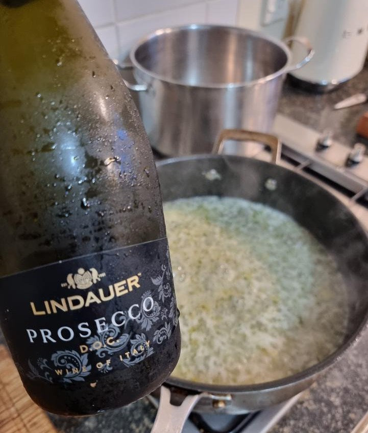 • Add the prosecco, bring to a gentle boil, and reduce to about half.